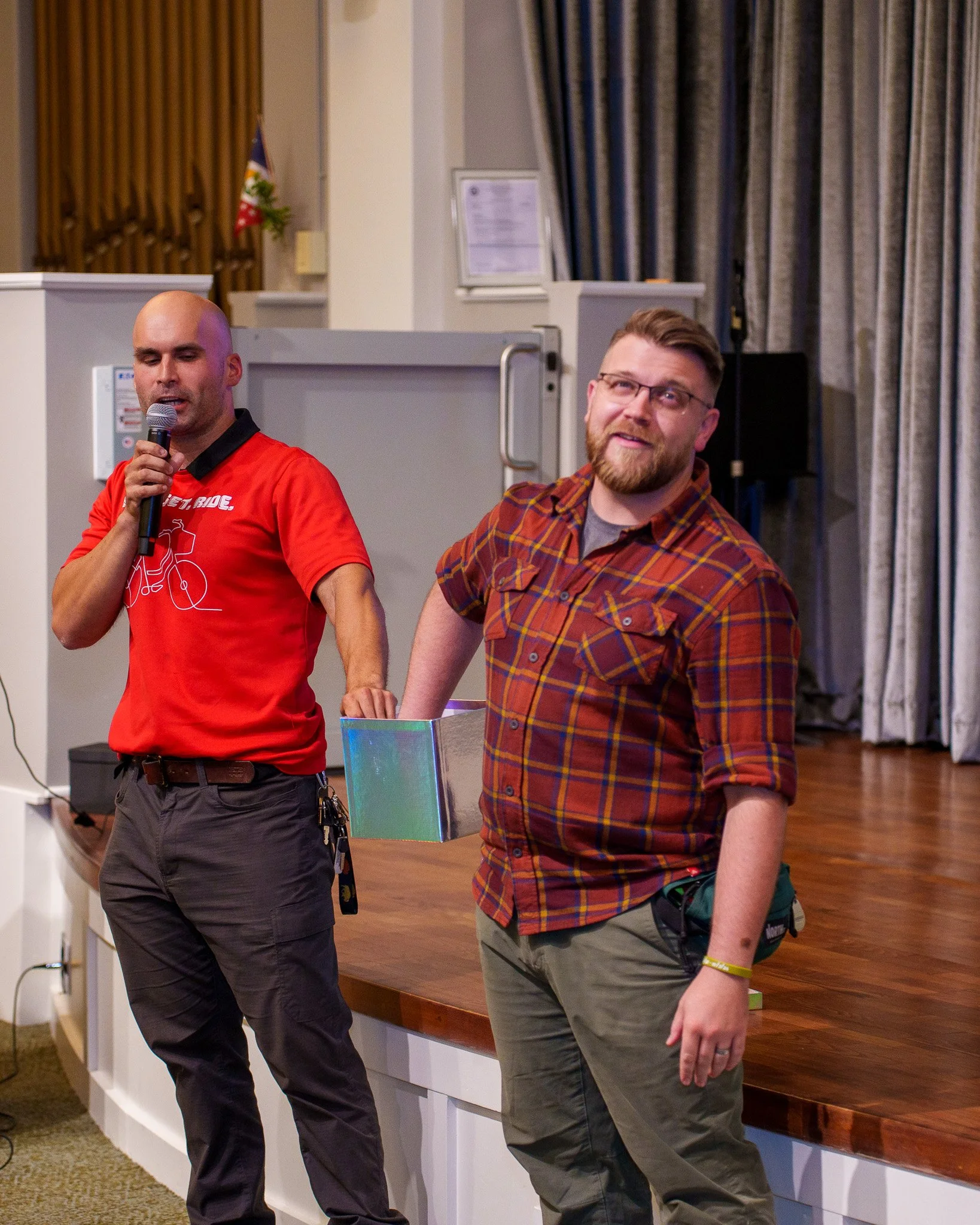 But we weren't settled on giving Mike only a prize pack! Our friends at Cleverhood, a maker of all-weather gear designed for bicyclists, learned of Mike's story weeks ago and made a generous donation to keep him biking even when the weather doesn't want to cooperate! They donated not just one rain cape to Mike, but a second cape to his wife Rosaleen, who introduced Mike to bikeshare years ago and logged 475 miles during this year's contest! And the folks at Cleverhood also printed the Reddy logo on them! The family was joined on stage by their son Ezekiel who was proud to bike his own 104 miles alongside his father!